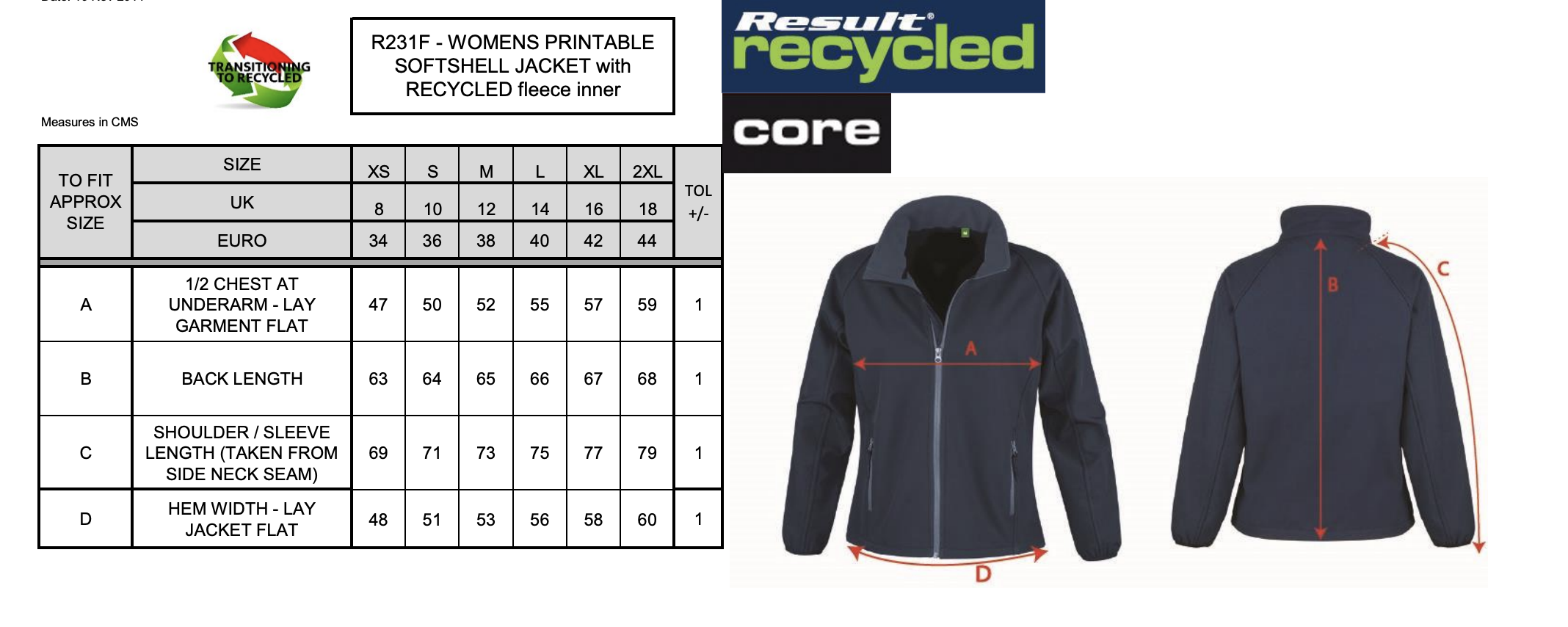 Two layer soft shell. Polyester soft shell outer. Micro fleece inner layer. Elastane-free, crimped yarn stretch easy to print fabric. Showerproof, windproof and breathable. Shaped fit. Decorative top stitch. Full length contrast zip with chin guard and inner zip guard. Two front zip pockets. Elasticated bound cuffs. Cut out label. Designed for direct print, embroidery and transfer print (not DTG). Co-ordinates with RS232F.