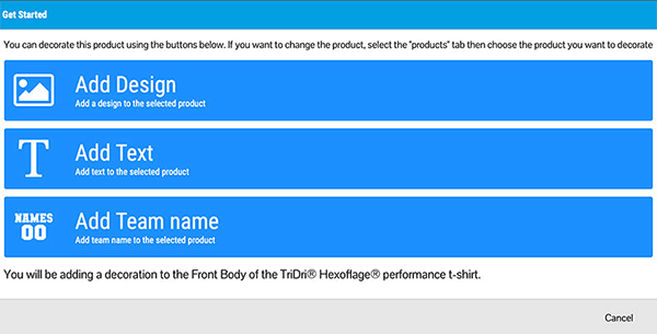 The opening pop-up window invited you to add a design, Add text or add a team name.
